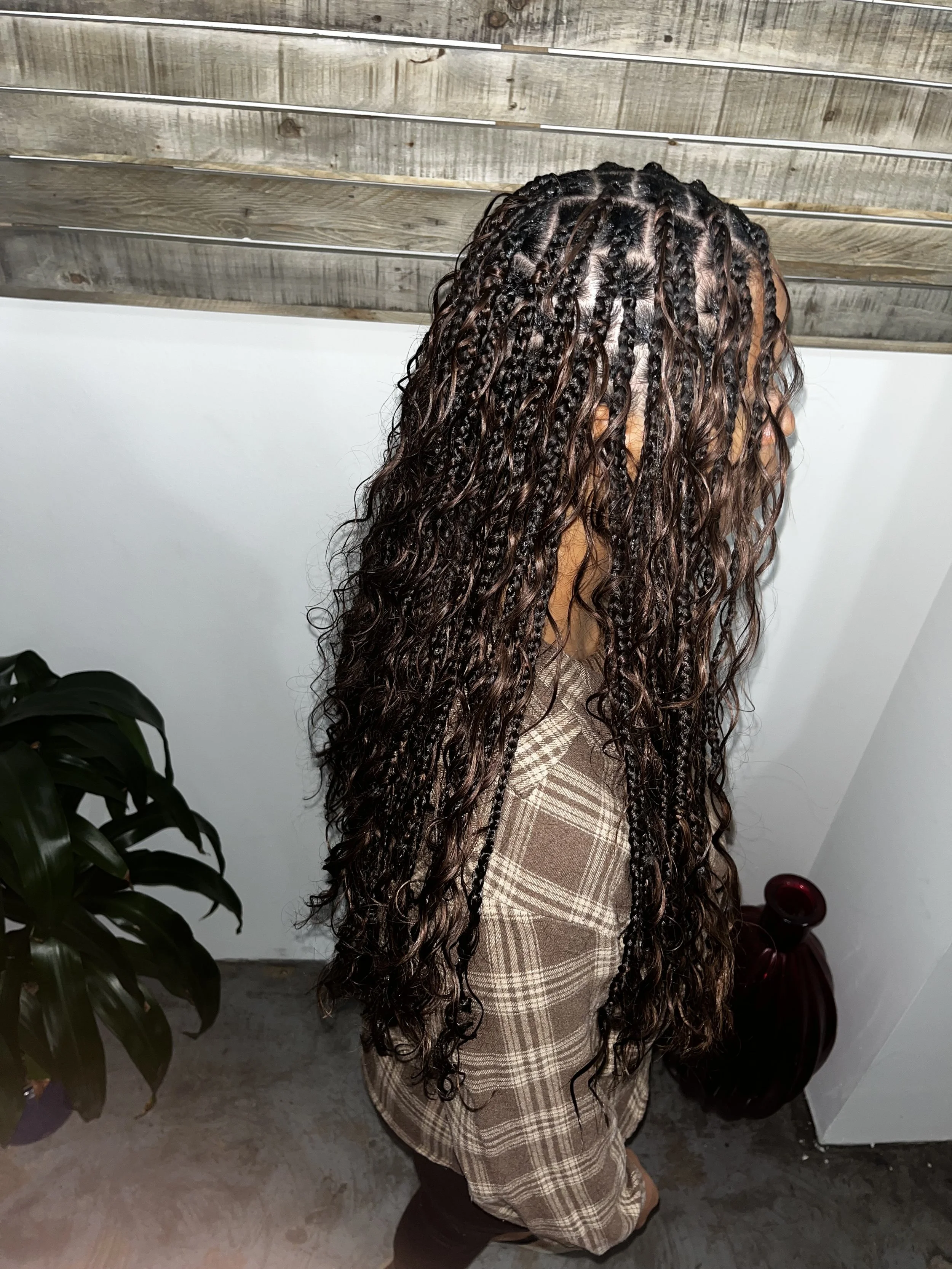 Full boho knotless braids including human curly pieces added throughout each braid creating a natural, effortless, & chic vibe that celebrates natural textures and individuality.